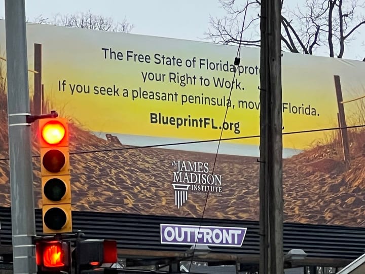 📣 States Try to Lure Michigan Businesses: A billboard along I-496 in Lansing reads “If you seek a pleasant peninsula, move to Flordia.” Paid for by the conservative Florida think tank, the James Madison Institue, the ad hopes to strike a nerve with Michigan business owners frustrated by the recent right-to-work appeal. Flaunting pro-business legislature, North Carolina has also attempted to lure away conservative Michiganders.