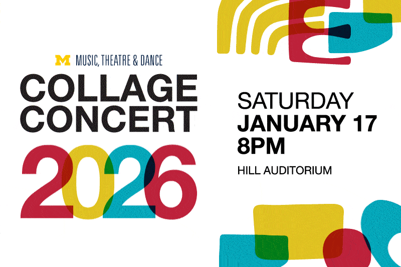 🎉 Collage Concert 2026: Don’t miss the one-of-a-kind Collage Concert on Saturday, January 17th, 8:00 PM at Hill Auditorium. Collage features over 30 different amazing numbers – music of all kinds, opera, musical theatre, dance, theatre – performed one after another without pause. Fun for all ages! You won’t want to miss it.